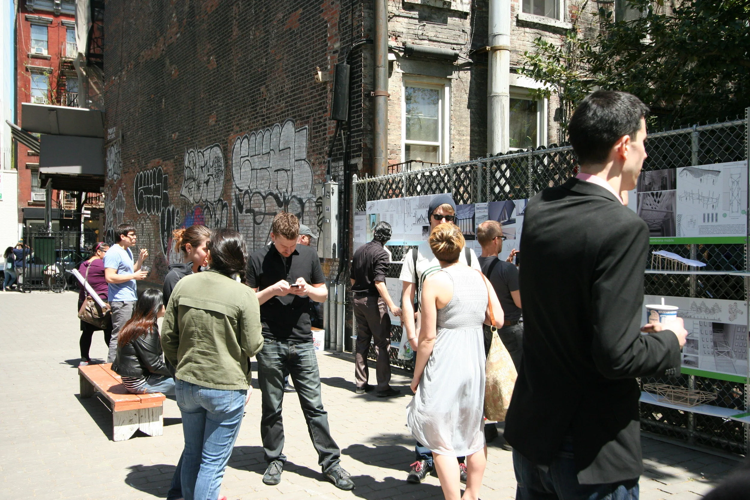 As we planned, organized, participated-in, and watched the events at First Street Green, we noticed a peculiar occurrence. For example, during a theatrical performance, a dog-walker would arrive and walk through the performance; during a conference a group of school kids would run across the site. The park opens at dawn and closes at dusk. During the day, residents in the area use the park as a shortcut between 1st Street and Houston Street, passersby walk in to look at the murals, the sculptures, to sit under a tree, to have a cigarette, to arrange to meet friends, to tag a wall.